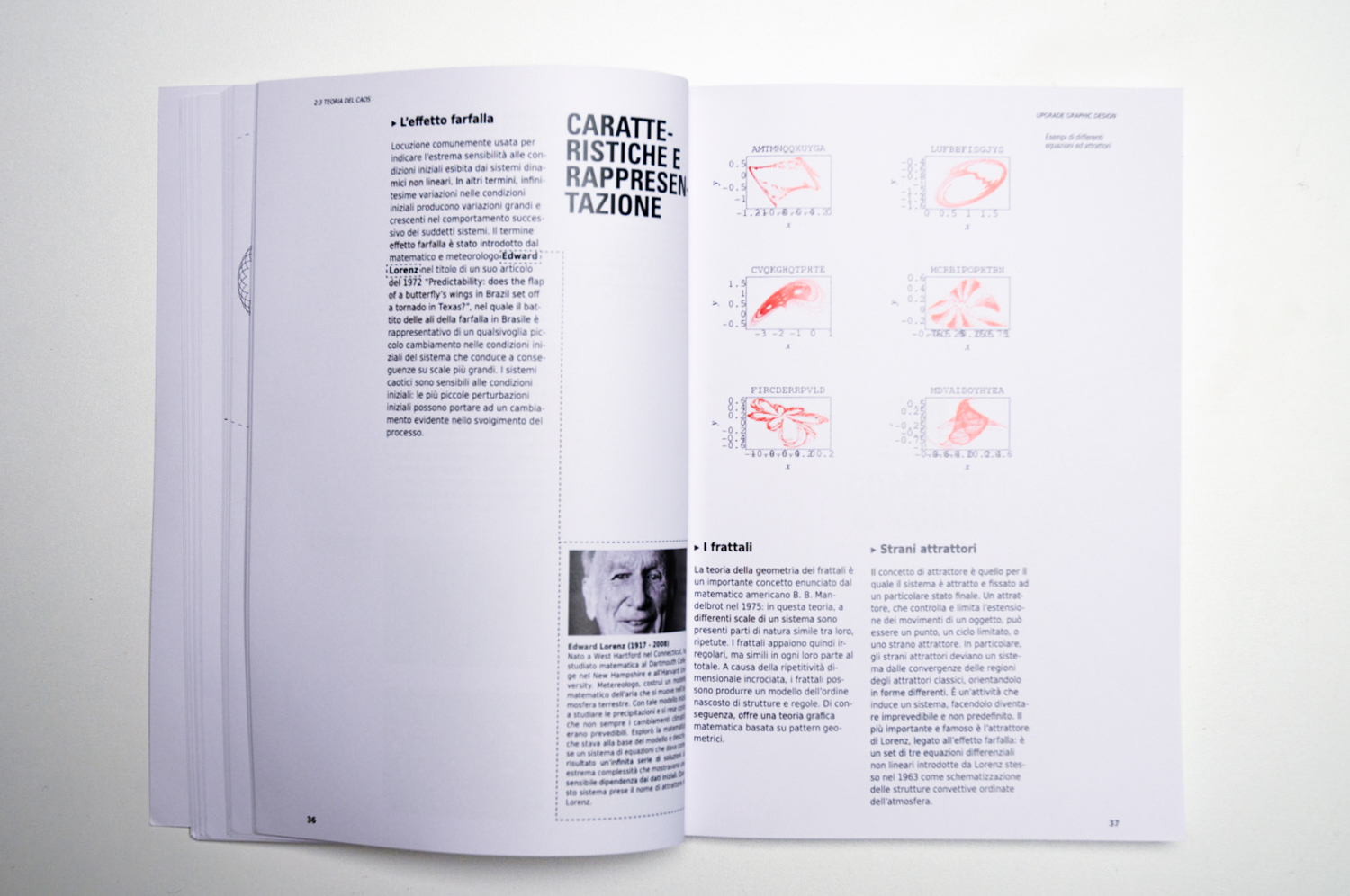 The book itself represents the goal of the project: revealing the underlaying scientific and mathematical layer of graphic design, creating a new exhibition’s experience through an interactive and immersive space. The visuals of the book are inspired by scientific graphs and visualizations, using only black lines and typography to display the content. The logic of the project and book’s chapters are visualizations themselves, creating a coherent overall mood that recalls the UPGRADE museum brand and logo.